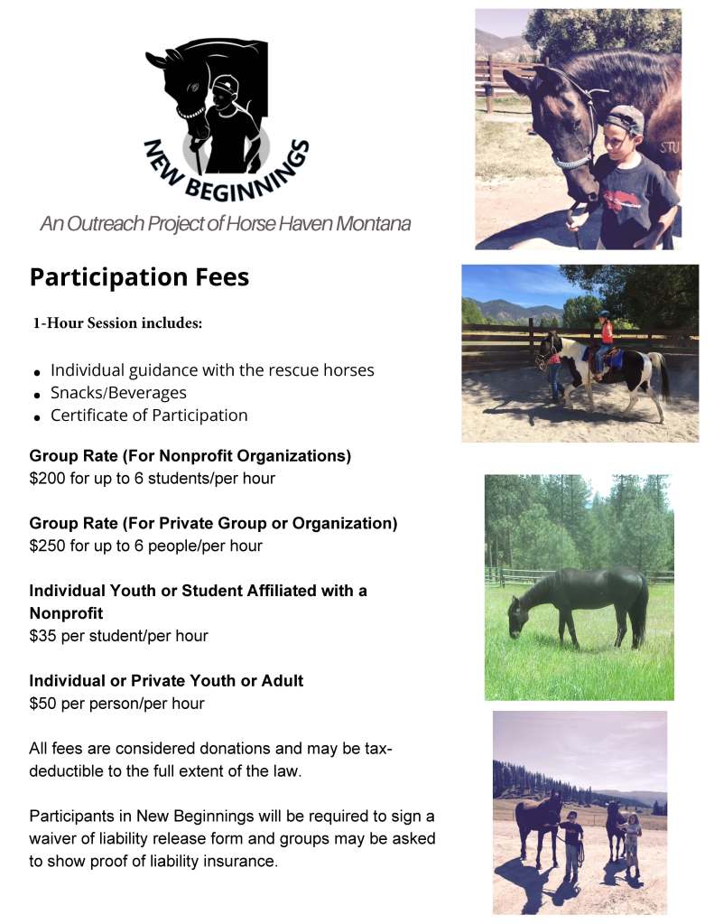 If you would like to learn more about the program, participate or donate to support New Beginnings or to offer scholarships, your contribution is fully tax-deductible up to the full extent of the law. We are a 501(c)(3) nonprofit. Please contact us by email horsehumannature@gmail.com or jrt@montana.com or call our Cell at 406-880-0683. Donations can be made online through PayPal or by check. Please let us know if you would like an application or you wish to sponsor someone with a scholarship. Thank you!